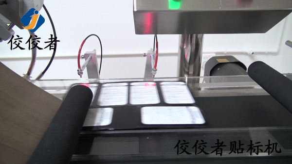 (圖3)展示的是凹面塑料盒雙標頭貼六張商標(第二個標頭針對同一列位置連續貼兩張商標),作業方式:由圖2第一個標頭貼完四張商標后傳輸帶帶動進入第二個貼標頭(由圖3 從左到右數起第二個測物電眼識別到產品貼標位置,啟動程序時間第二個貼標標頭出標完成第五張商標同時覆好商標,依此類推完成第六張商標。至此,貼標過程就已經完成了. (操作過程:傳輸帶動來料產品—>第一個貼標頭貼好四張商標并覆標(設備自動實現)—>第二個貼標頭貼好兩張商標—>傳輸帶帶動進入下一道制作藝流程。)如以下(圖4 圖5):
