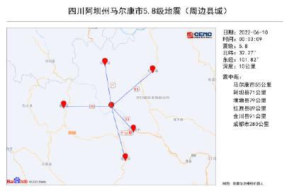 中國地震臺網正式測定:06月10日00時03分在四川阿壩州馬爾康市發生5.8級地震,震源深度10千米。