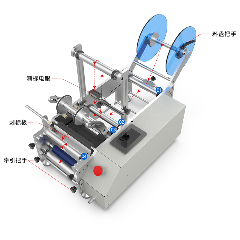 5)拉長標簽經過第四根底軸,從這里繞上來經過剝標版,最后從藍色軸和白色軸中間穿上來;
