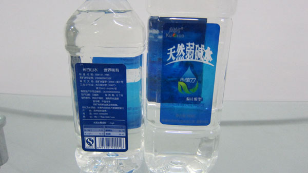 上圖是礦泉水瓶貼標機對方形礦泉水瓶進行雙側面貼標后的樣品圖片。