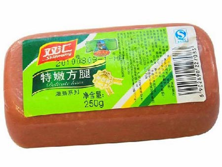 在標題上我說了,還有方形的。現在市場上方形的火腿腸也不少。能貼這個的機器也有。下面來看一下我公司的全自動平面貼標機對  方形火腿腸進行貼標的樣品圖片。