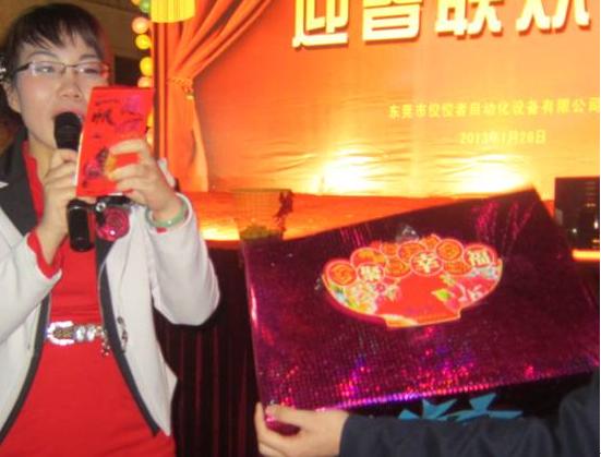 腦筋轉(zhuǎn)過之后,第一輪的抽獎也開始了,由我們的營銷總監(jiān)梁總抽取幸運兒。獎品是現(xiàn)金100元,抽20個。看看主持人那歡喜的模樣。