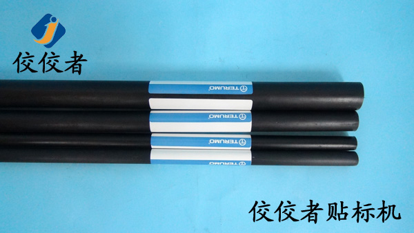 上圖展示的是工作人員將需要貼標的PE管放在方便拿取的位置以增加貼標的效率,此時有一個步驟在圖片中沒有展示出來,那就是接通電源之后需要做的就是將PE管放在包膠軸與覆標海綿軸待貼位置,可根據產品直徑的大小進行調整,然后踩腳踏,此時貼標過程已經完成.看似只有一秒鐘的時間,在這個時間中,機器進行了一系列的工作。當腳踩發出信號,電機轉動帶動PE管轉動,并送出標簽到PE管上,一邊出標一邊覆標.至此,貼標過程就已經完成了。(操作過程:放產品—>貼標并覆標(設備自動實現)—>取出已貼標產品。)如下圖: